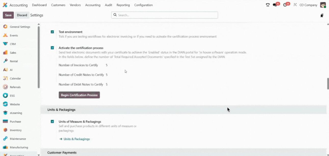 Para realizar el nuevo proceso de habilitación, se recomienda hacerlo en una base de pruebas. Se debe activar el checkbox de "Entorno de prueba" y "Activar proceso de certificación" e indicar la cantidad de documentos que solicita la DIAN para la habilitación (este número varía, se debe consultar el portal de la DIAN)