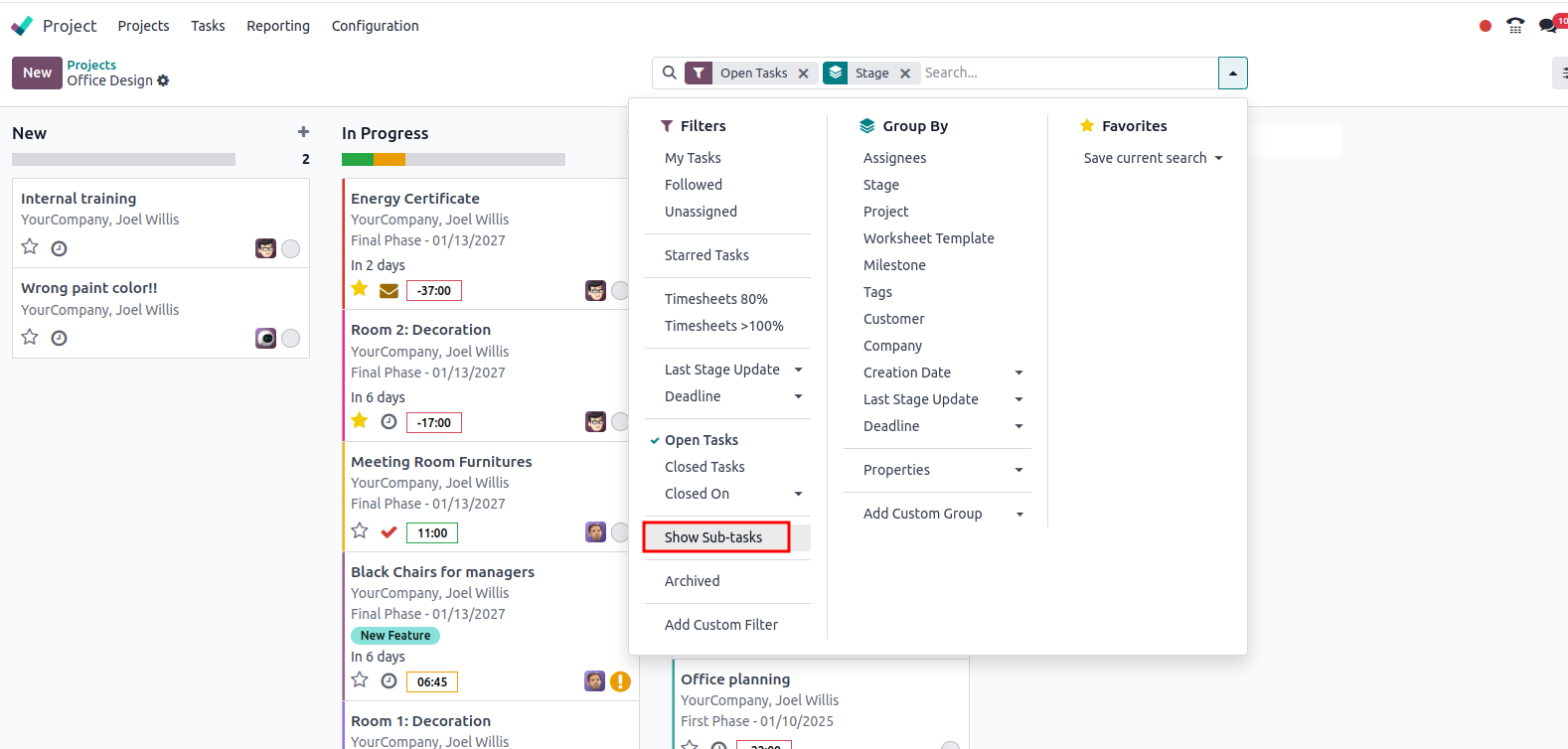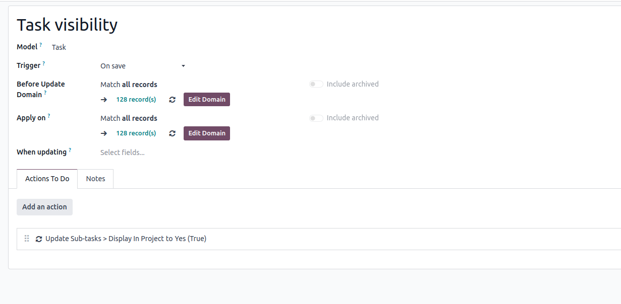 0 编辑 关闭 删除 标记 Subtask visiblity by default - Odoo 18 编辑 关闭 删除 标记 odoo 13 一月 2025 退订 订阅 评论 分享 贴子评论 丢弃 1 答案 0 odoo 13 一月 2025 最佳答案 You can create the following automated action : Please note that this feature has been changed in 18.1 : you now have a general filter "Show subtasks". 备注 分享 1 备注 贴子评论 丢弃 odoo - 23 四月 2025 删除 转换为答案 Perfect, thanks!